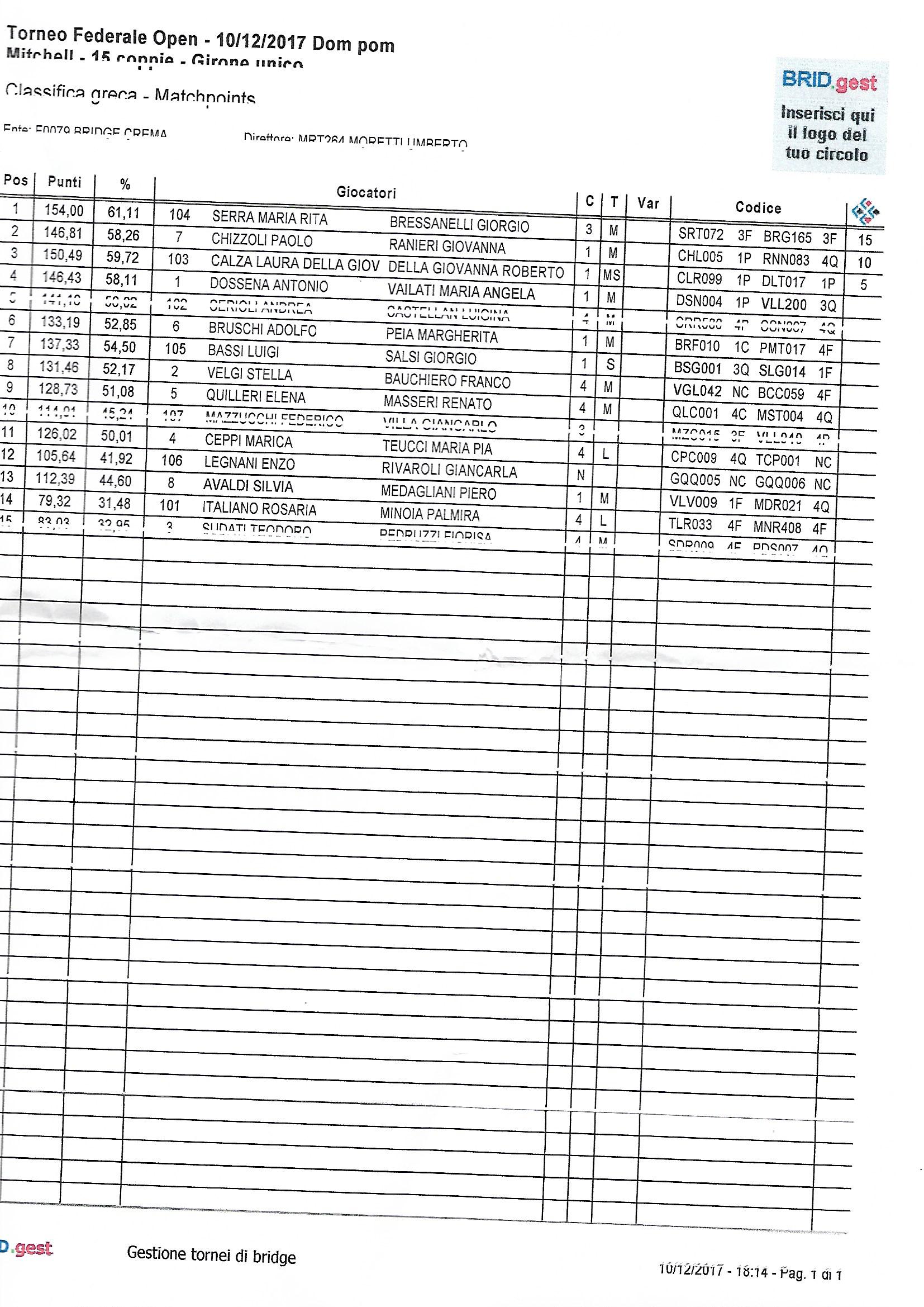 Risaltati torneo di Natale 2017 - Associazione Bridge e Burraco Crema